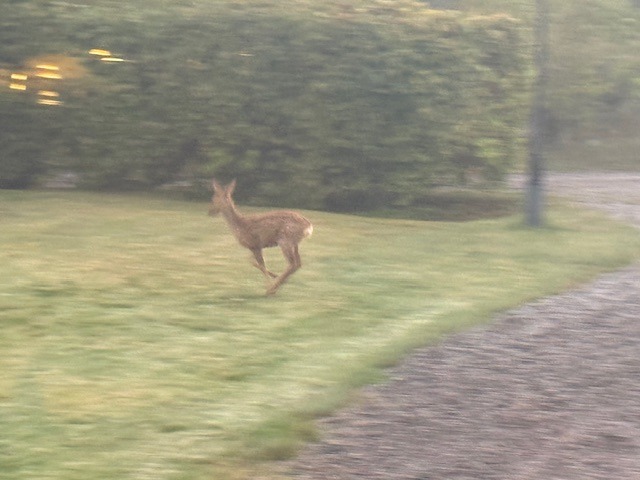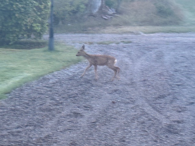 Eftersom jag inte hann klart igår kväll var jag uppe väldigt tidigt i morse för att bygga klart vedskjulet. Det var fortfarande alldeles svart ute vid morgonkaffet så jag passade på att packa ihop och förbereda allting inomhus medan det ljusnade. Precis när jag skulle ge mig ut dök det upp tre rådjur på gårdsplanen.