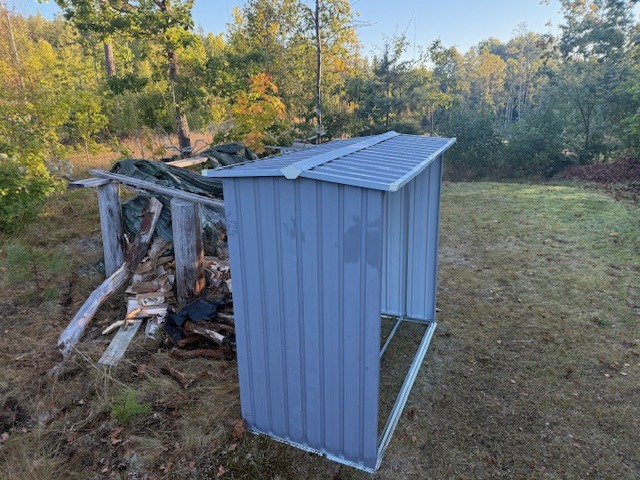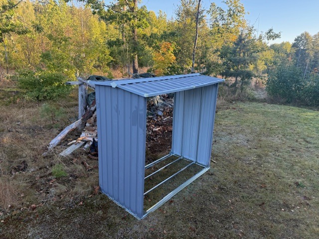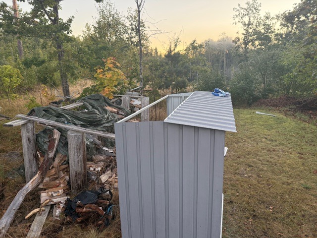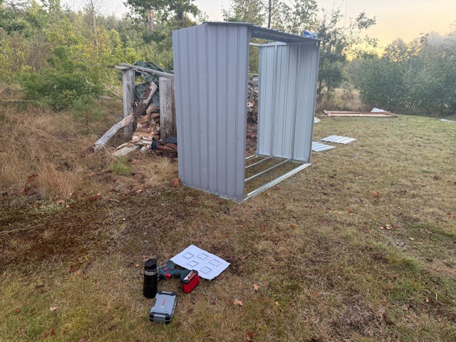 Gjorde sedan klart vedskjulet. Gav upp i mörkret igår när jag fått dit takplattorna på ena halvan. Fick nu ihop allting innan första jobbmötet. Byggsatsen funkade väldigt bra, det var bara ett par hål som fattades på en av delarna som jag enkelt borrade dit. Däremot gav jag upp på att nu på morgonen hålla på att försöka sätta dit de små muttrarna i takkonstruktionen med stelfrusna fingrar mot iskall metall. Valde att spara det till solen är framme på eftermiddagen istället.