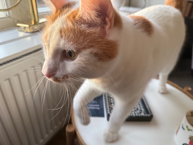 Katten lät sin frustration över gråvädret och regnet gå ut över jultomten nu på morgonen. Skägget var för intressant så med snabbaste högertassen i västern åkte tomten i golvet idag. Första gången bara tomten men senare också med blomkruka och allt. Det är väldigt otypiskt för Simba, han har inte vält något i fönstren sedan i Kävlinge när han var riktigt liten.