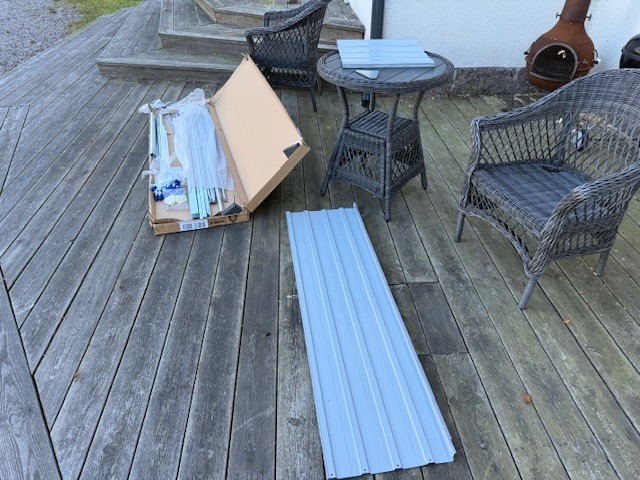 Vedskjulet var en enklare byggsats men började snällt på första sidan i beskrivningen att tala om att man behövde två man och en skruvdragare. Hade inte planerat för det utan räknade med att slå upp den där ajälv. Bad i alla fall grannen att tittta förbi 1-1,5 timme senare för att kolla om jag behövde hjälpa att få upp taket eller något.