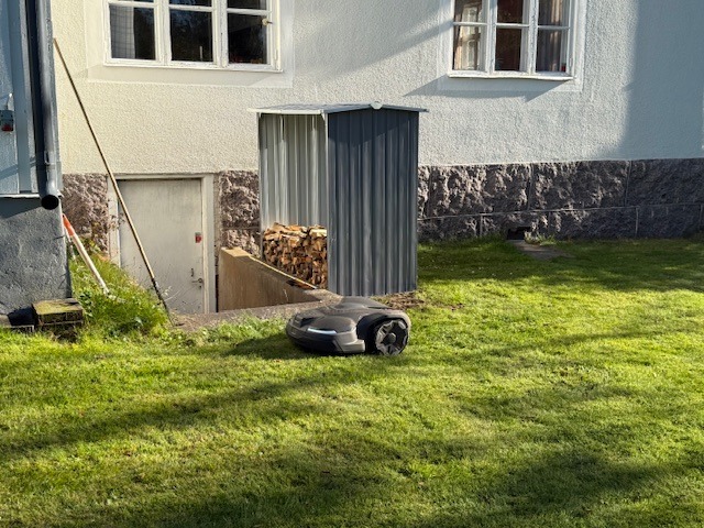 När jag var klar med mina möten idag fixade jag dit de sista muttrarna på vedskjulet och började sedan kärra ner ved till huset. Flytten av skjulet uppifrån vedbacken ner till källartrappan hjälpte grannen till med när han kom hem från jobbet. Vikten var inga problem, kanske 15 kilo totalt, men det var för otympligt att flytta ensam. Innan han kom hade jag redan lastat in ett par rejäla skottkärror ved i tornet och tippat ett antal skottkärror på gräsmattan för att däriifrån snabbbt stapla in i skjulet för att få lite stabilitet. Att flytta ner resten av veden inför vintern gör jag nästa gång jag är nere.