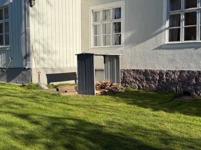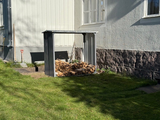 Nu har vi en bra lösning för veden här på Lilla Grönkulla. Valde att ställa vedskjulet nere vid källartrappan för att vi enkelt ska kunna hämta in mer ved efter hand, främst till kaminerna men också lite som prep också till vedpannan vi har kvar nere bredvid bergvärmen i pannrummet. Vi har nu också ett litet mellanlager vid grovingången i tornet så att man inte behöver ut i de värsta ovädren för att fylla på med ved.